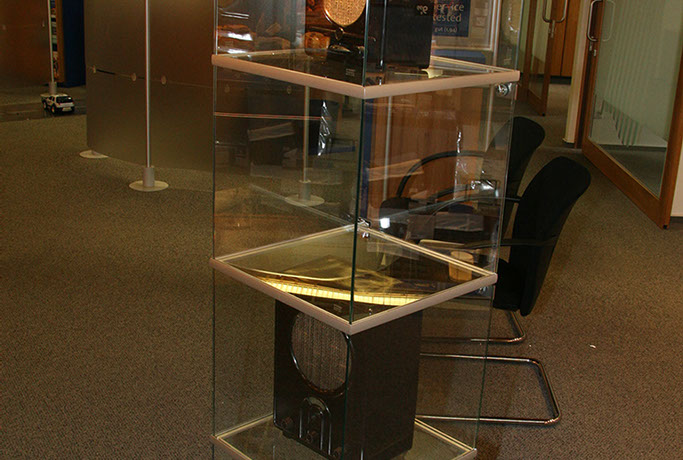 Für Ihre Präsentation von kleineren Ausstellungsstücken bieten sich unsere Glasvitrinen an. Diese sind 0,4 x 0,4 m groß und haben eine Höhe von 1,80 m. Durch die integrierte Beleuchtung erscheinen diese in einem angenehmen Licht.